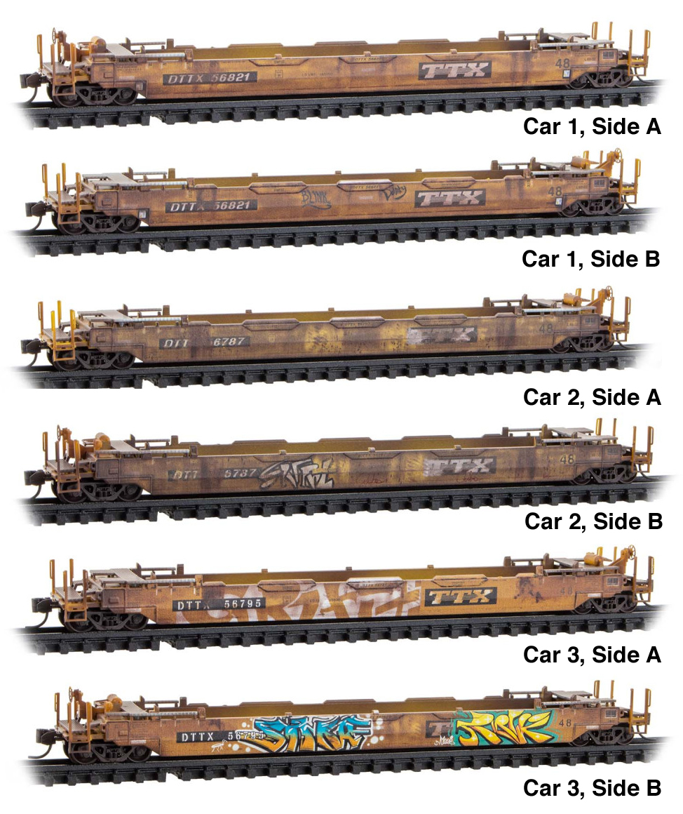 70' Husky Stack Well Cars TTX - DTTX - #'s 56787; 56795; 56821 (3-Car Runner Pack) ------------------------------- Weathered & Graffiti Yellow Cars w/Black & White Lettering Plastic Jewel Cases |