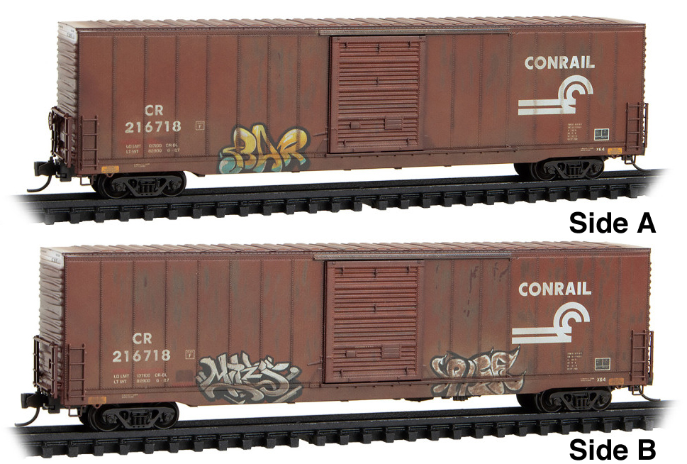 60' Single Sliding Door Box Car - w/Smooth Sides Conrail - CR - #216718 Brown Car w/White Lettering -------------Weathered, Graffiti |
